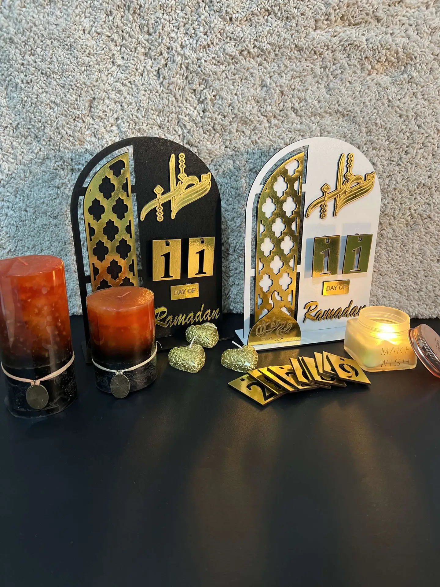 رزنامة أيام رمضان بتصميم أنيق باللونين الأبيض والذهبي، تساعدك على تتبع أيام الشهر الكريم وتضيف لمسة روحانية راقية لبيتك